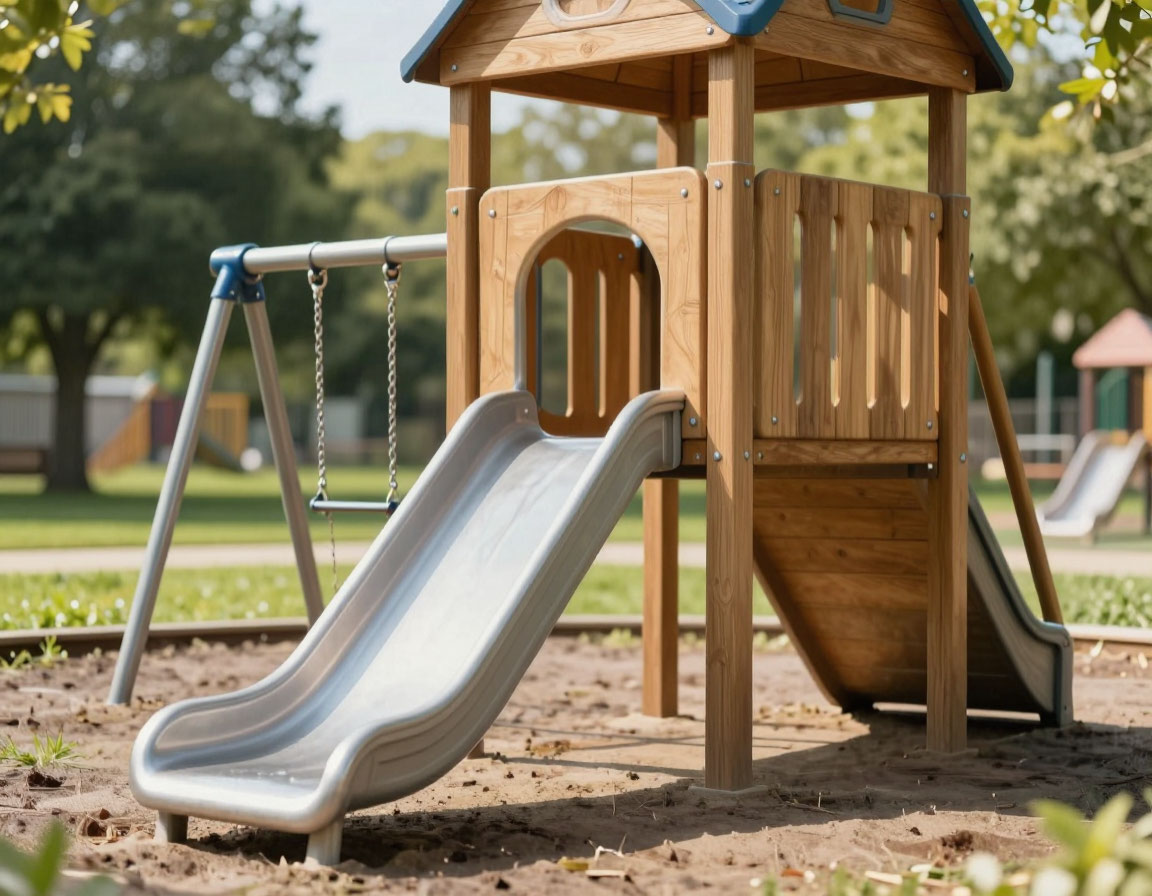 Главная проблема металлических элементов — перегрев. Летом металлические поверхности на солнце могут нагреваться до 60–70°C, что создает риск ожогов. Именно поэтому горки, поручни и сиденья часто делают из пластика или покрывают специальными материалами.