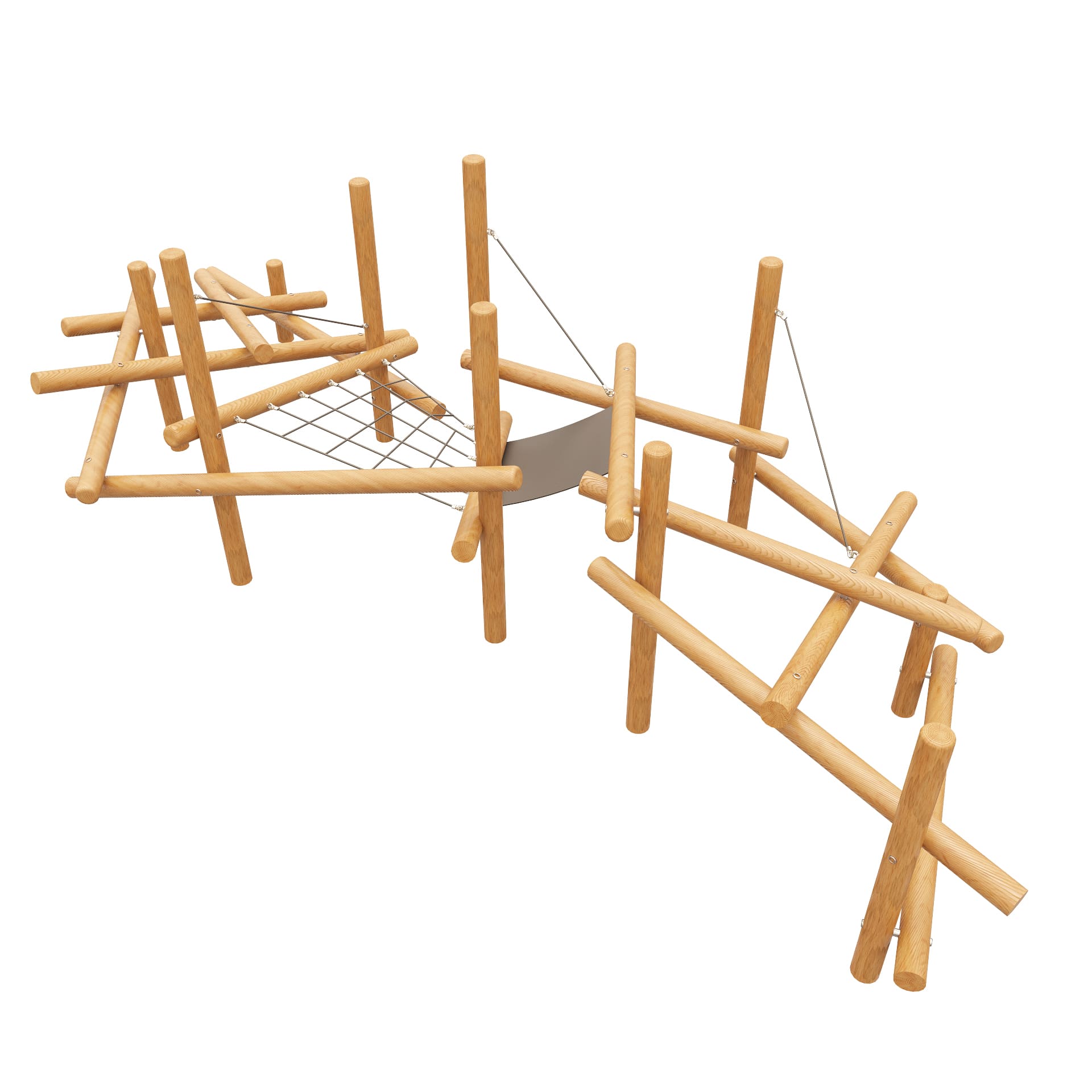 • Комбинированные площадки, где силовые элементы соседствуют с канатными лабиринтами (для детей от 7 до 14 лет).